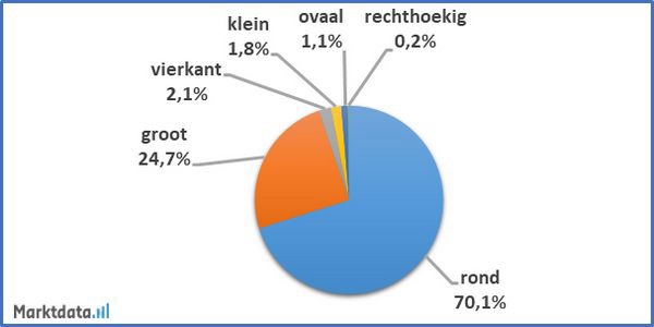 Ruim 70 procent van het zoekvolume met vormaanduiding heeft betrekking op ronde vloerkleden. Op de tweede plaats staat groot met een aandeel van bijna een kwart in het zoekvolume. De top-5 wordt gecompleteerd door vierkant, klein en ovaal.