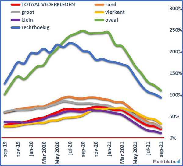 Onderstaand figuur toont de voortschrijdende procentuele jaarmutatie van het aantal zoekopdrachten van de belangrijkste vormen. Daarbij zien we dat de vormen ovaal en rechthoekig structureel aan populariteit winnen. Kleine vloerkleden laten een beneden gemiddelde ontwikkeling zien van het zoekvolume. Ronde en grote vloerkleden lagen qua ontwikkeling van het zoekvolume een stuk boven gemiddeld, maar zijn inmiddels afgezakt naar de middenmoot. Vierkante kleden doen het in het lopende jaar 2021 boven gemiddeld goed.