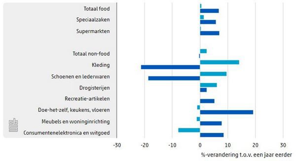 Voor winkels in meubels, woninginrichting, doe-het-zelfartikelen, keukens en vloeren daalde de omzet juist. Zo daalde de omzet van meubels en woninginrichting ten opzichte van een jaar eerder met 1,1%. Bij de doe-het-zelf-, keukens- en vloerenbedrijven daalde de omzet 0,9% (zie afbeelding 2).