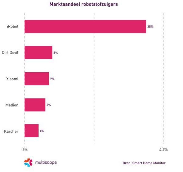 De Roomba robotstofzuigers van iRobot zijn veruit het populairst. Het merk heeft nu een marktaandeel van 35%, een stijging van 2% ten opzichte van de vorige periode. Ruim na iRobot volgen de robotstofzuigers van Dirt Devil (8%), Xiaomi (7%), Medion (6%) en Kärcher (4%).
