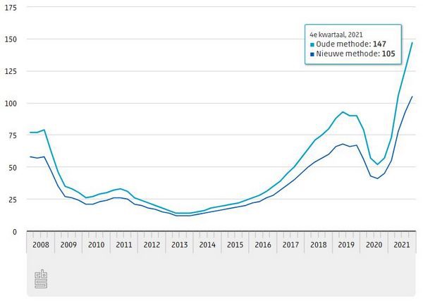 De spanning op de arbeidsmarkt is in het vierde kwartaal van 2021 verder toegenomen, het resultaat van een aanhoudende groei van het aantal vacatures (met 16 duizend) en een verdere daling van het aantal werklozen (met 29 duizend). Ook het aantal banen bleef groeien; er kwamen er 44 duizend bij in het vierde kwartaal. Dat meldt het CBS op basis van nieuwe cijfers.