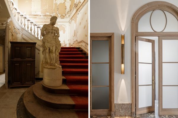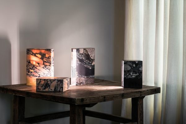 In tegenstelling tot de ontwerpen van Sofisticato - die bedoeld zijn als functionele verlichting en zelf niet te veel aandacht trekken - vallen de lampen uit de eigen collectie van Koen Van Guijze op. Ze zijn gedurfder, balanceren op de grens tussen kunst en design, en zijn vaak gemaakt van recuperatiematerialen, zoals resten marmer of onconventionele materialen uit een heel andere context. Zo liet hij zich voor zijn y-lamp inspireren door de kleuren van de radicale Italiaanse Memphis-beweging, terwijl de lamp op een speelse manier tegelijk vragen stelt bij onze huidige tijd.