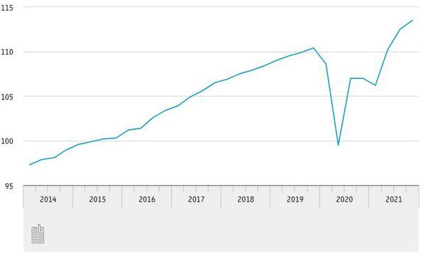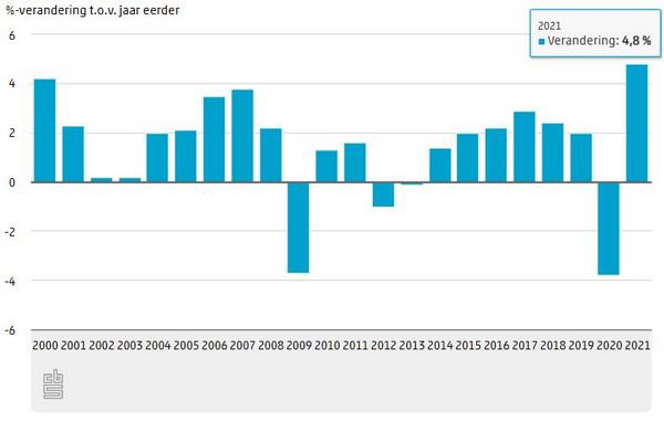 De groei in het vierde kwartaal 2021 ten opzichte van het vierde kwartaal 2020 kwam uit op 6,2 procent. Met het beschikbaar komen van het vierde kwartaal is ook het eerste voorlopige groeicijfer voor het jaar 2021 bekend. Het bbp is vorig jaar met 4,8 procent gegroeid. Dat is vooral toe te schrijven aan het grotere handelssaldo en de hogere consumptie door huishoudens. Ook de overheidsconsumptie en de investeringen lagen hoger dan in 2020. In vergelijking met 2019 bedroeg de groei vorig jaar 0,8 procent. De krimp van 3,8 procent in 2020 is in een jaar tijd goedgemaakt.
