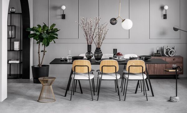 "Dol op Parijs? Laat je meenemen naar een elegant Parisien appartement met de voorjaarstrend House of Gray. De hoge plafonds en grote ramen met luiken zorgen voor de Franse allure die dit interieur uitstraalt. Creëer moderne, urban luxe door grafische vormen te combineren met klassieke elementen." Het kleurenpalet is simpel: deze trend bevat veel grijs, zwart-wit en betontinten afgewisseld met goud en zilver voor het contrast. Zware materialen zoals beton, marmer, zwart metaal en steen zijn hierbij onmisbaar. Het geheel geeft je een minimalistisch modern gevoel met een vrouwelijke touch.