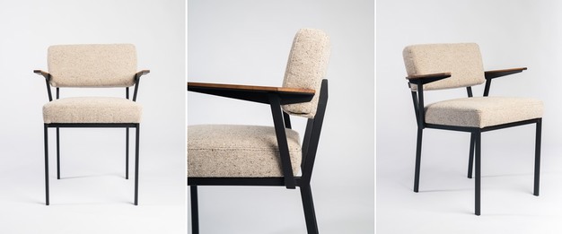 De stoel voelt door de zwevende rug licht en luchtig aan. Het frame van gepoedercoat metaal en de notenhouten armleggers voegen karakter toe aan de Concept 1.