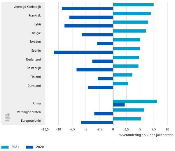 In de omringende landen was de economische impact van het coronavirus op de economie in 2020 groter dan in Nederland. Daardoor hoefde Nederland in 2021 een minder grote inhaalslag te maken dan onze buurlanden. In vergelijking met 2019 groeide de Nederlandse economie met 0,8 procent. Ook in België was de economie in 2021 een fractie groter dan in 2019. Maar de economieën van Frankrijk en het Verenigd Koninkrijk hadden de forse schade door corona een jaar later nog niet helemaal goedgemaakt, ondanks een groei in 2021 van 7,0 en 7,5 procent.