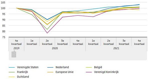 De economieën in Nederland, de ons omringende landen en de Verenigde Staten waren in het vierde kwartaal van 2020 allemaal een stuk kleiner dan in het vierde kwartaal van 2019. Gedurende 2021 steeg het bruto binnenlands product (bbp) in de genoemde landen echter gestaag. Het bbp van de Verenigde Staten lag in het tweede kwartaal 2021 weer boven het niveau van het vierde kwartaal 2019. Nederland, België en Frankrijk volgden een kwartaal later. De Europese Unie, ten slotte, ging in het vierde kwartaal van 2021 over het pre-coronaniveau heen. De Nederlandse economie was in het vierde kwartaal bijna 3 procent groter dan in het vierde kwartaal 2019.