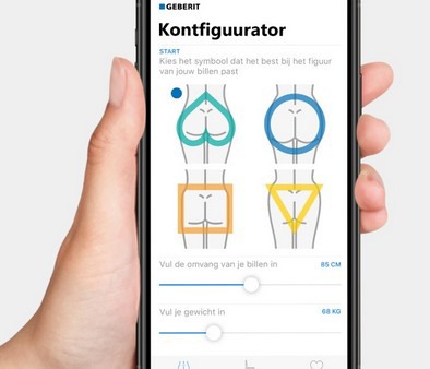 Voor het bepalen van de perfecte wc-bril heeft Geberit een speciale app ontwikkeld. In deze kontfiguurator-app kan de consument eenvoudig zijn of haar vorm billen selecteren. Door ook de bilomvang in centimeters en het lichaamsgewicht aan te geven, selecteert de app de best passende wc-bril.