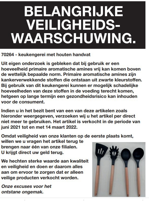 "De afgifte van primaire aromatische aminen is hoger dan wettelijk toegestaan. Primaire aromatische aminen zijn kankerverwekkende stoffen die ontstaan uit zwarte kleurstoffen. Als u dit product gebruikt kunnen er schadelijke hoeveelheden van deze stoffen in eten terecht komen. Op lange termijn kan dit schadelijk zijn voor de gezondheid. Gebruik het keukengerei niet", meldt de Nederlandse Voedsel- en Warenautoriteit.