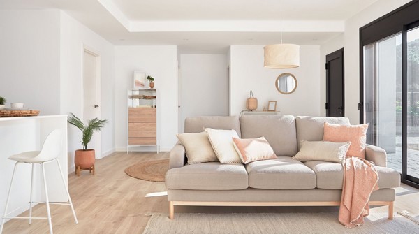 Eén ruimte waarin alles is gecombineerd: de woonkamer, eetkamer en keuken. Kave Home krijgt het voor elkaar. Het meubelbedrijf speelt in op kleiner behuisde huishoudens. Met o.a. de Mihaela bank, een ontwerp van Kave Home die met haar micro-bouclé bekleding gemaakt is om trendy te zijn. 'Bovendien is de bank planeetvriendelijk', meldt het meubelbedrijf.