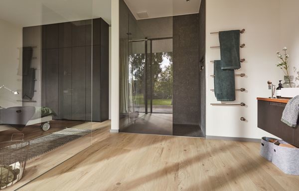 Hoogwaardige houtdessins voor een stijlvolle badkamervormgeving: de waterproof Rigid-vloeren van MEISTER zijn ideaal om in de badkamer te leggen (hier: MeisterDesign. rigid RD 300 S, eik Hampstead 7397, houtdessin).