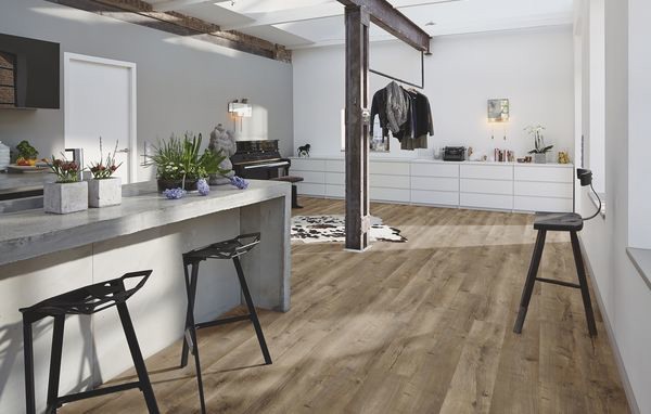 Lange planken zonder decorherhaling: de vloeren uit de collectie RL 400 S zijn absoluut uniek (hier: eik gebarsten Terra donker 7433, houtdessin).