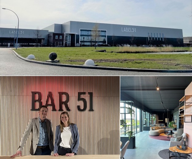 Boven het nieuwe pand van LABEL51 dat gekoppeld is aan het linkse bestaande pand. Onder Edwin den Ouden met Carmen van den Brink en rechts een blik in het Experience Center.