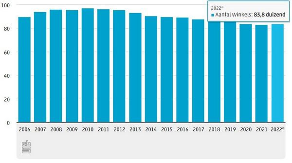 Op 1 januari 2022 waren er 83,8 duizend fysieke winkelvestigingen in Nederland, 655 meer dan een jaar eerder. Hiermee steeg het aantal winkels voor het eerst sinds 2010. Vooral het aantal winkels in de voedingssector nam toe, het aantal boekwinkels daalde het sterkst. Dit meldt het CBS op basis van nieuwe voorlopige cijfers.
