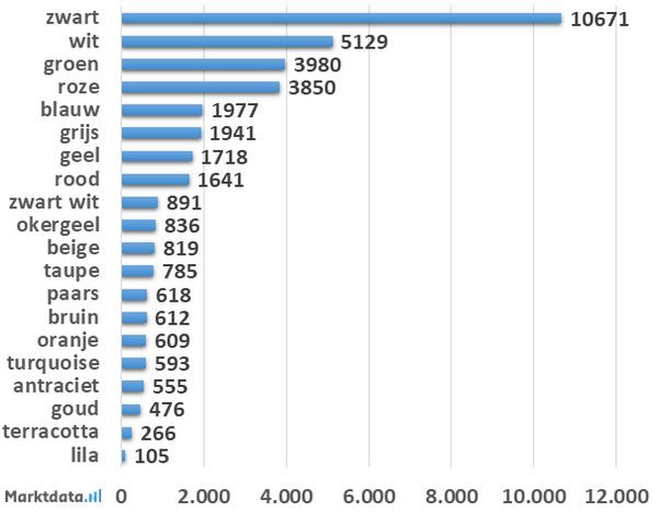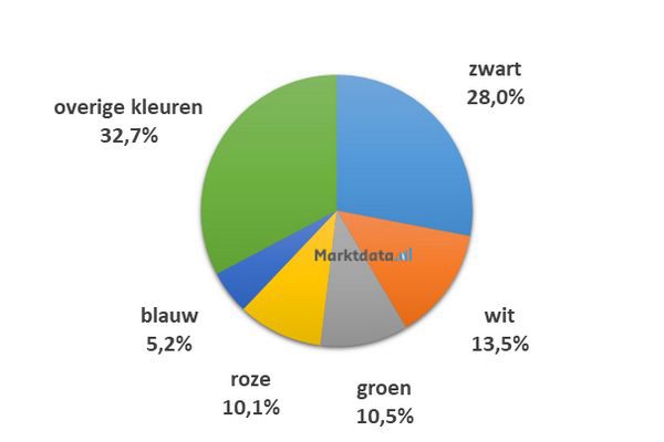 28 Procent van het zoekvolume met kleur aanduiding heeft betrekking op zwart. Op de tweede plaats staat de kleur wit met een aandeel van 13,5 procent in het zoekvolume. De nummer drie is groen, die 10,5 procent van het zoekvolume vertegenwoordigt.