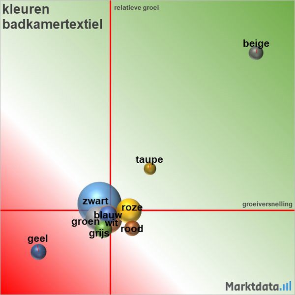 Uit bovenstaand figuur blijkt dat de kleur geel op zijn retour is. Beige badkamertextiel is zeer sterk in opkomst qua populariteit. Beige is een kleurnaam die gebruikt wordt voor een lichte kleur bruin. De kleur wordt ook wel aangeduid als zandkleur. Er zijn veel verschillende nuances van beige. Ook de kleur taupe doet het momenteel erg goed. Taupe is een rustige, natuurlijke kleur die tussen grijs en bruin in zit. Taupe bestaat in diverse tinten, van donker tot licht.