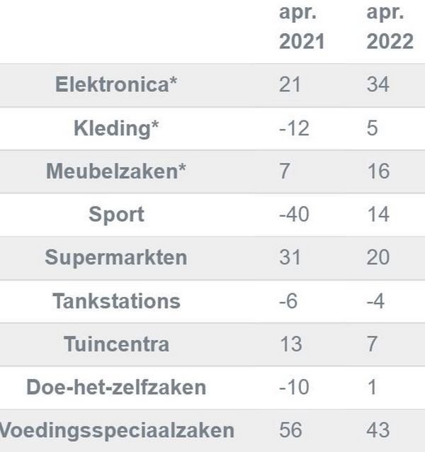 "Hoewel prijzen van bijvoorbeeld meubels, tuinproducten en huishoudelijke apparaten flink zijn gestegen, geven consumenten nog steeds veel geld uit in vergelijking met 2019, het jaar voordat de coronapandemie uitbrak. De particuliere klanten van ABN Amro besteedden in april 34 procent meer aan elektronica en 5 procent meer aan kleding in vergelijking met april 2019. In tuincentra werd 7 procent meer uitgegeven en in doe-het-zelfzaken 1 procent. Bestedingen aan meubels laten ondanks forse prijsstijgingen toch nog een toename van 16 procent zien ten opzichte van april 2019. Ook in supermarkten en voedingsspeciaalzaken werd meer uitgegeven dan in 2019", schrijft Gerarda Westerhuis van ABN Amro.