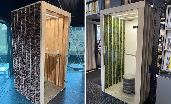 Elke belcel heeft een biobased wand van Silent Reed, Greenwall, Cork Rough, Bark of zelfs Seawood panelen. Zo kan je elke belcel een eigen signatuur geven. Hiermee laat Het Stille Verzet zien dat biobased materialen prima in een kantooromgeving passen. Zo kan circulair design er dus ook uitzien.