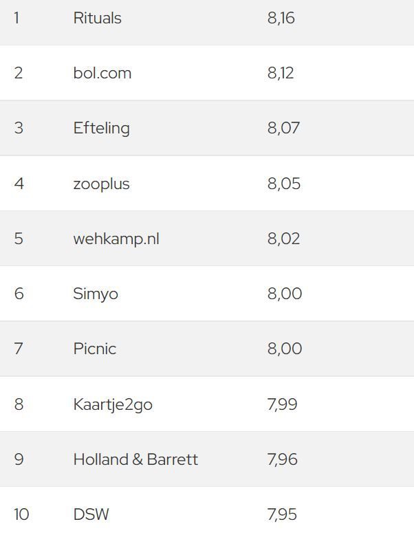 Rituals is wederom uitgeroepen tot het klantvriendelijkste bedrijf van Nederland. Net als in 2021 behaalde Rituals de hoogste score in het grootste onafhankelijke onderzoek naar klantvriendelijkheid van Nederland. Op plaats 2 staat bol.com en op 3 de Efteling. Dit jaar is de branche ‘goede doelen’ voor het eerst een afzonderlijke categorie. CliniClowns werd hier winnaar met waarderingscijfer 8,14.