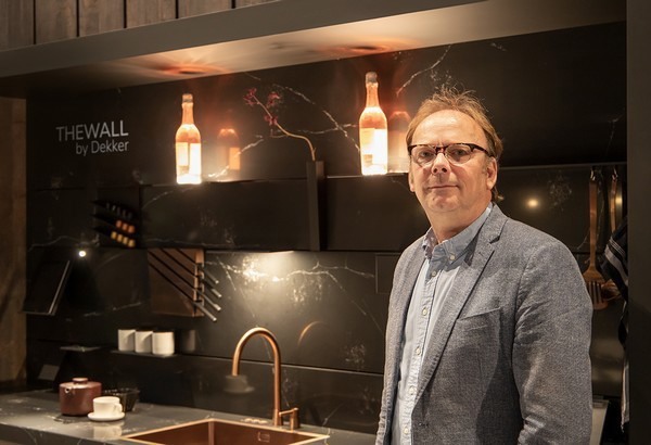 Woordvoerder Ben van Elk, poserend voor The Wall, een innovatief concept in achterwanden.