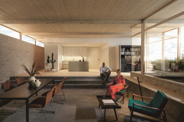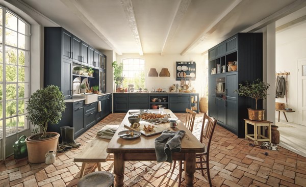 greeplijst het minimale lijnenspel. De L-vormige planning, die discreet in de ruimte is geïntegreerd, creëert een open en uitnodigend effect – uw gasten blijven graag langer aan het ruime kookeiland zitten. Dankzij de pocketkast die aan de keuken grenst, hier gebruikt als slim kantoor, ontstaat een vloeiende overgang tussen de woonruimtes – creativiteit kent geen grenzen.