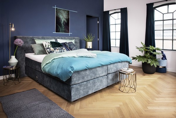 De materialen die gebruikt worden bij deze stijl zijn luxe. Kies bijvoorbeeld voor warm parket, velours en satijnen stoffen en maak het geheel af met messing en goudaccenten. Zo is de boxspring combinatie op deze afbeelding bekleed met de mooie velours stof Adore (in de kleur 158 Niagara) die voor een zeer luxe (hotel)uitstraling zorgt.