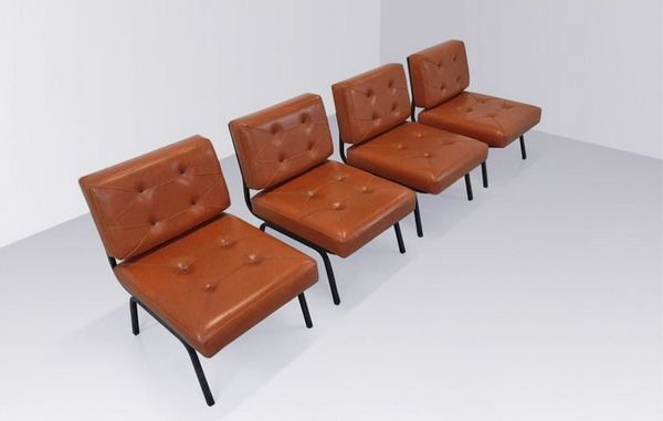 Strakke Italiaanse pantoffelstoelen van metaal en leer met knopen, aangeboden op Catawiki.