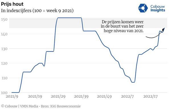 Door de stijging komen de houtprijzen in de buurt van het zeer hoge niveau van halverwege 2021, constateert bouwkostenbureau IGG Bouweconomie. “Voor bijvoorbeeld vurenhout betaal je nu 3 euro per meter, halverwege vorig jaar was dat 3,60 euro”, zegt bouwkostenexpert Mario van Veen. “Een maand geleden lagen de prijzen nog op 2,20 euro per meter.”