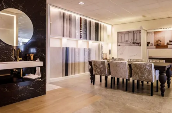 Die samenwerking pakte goed uit. Beneden veel badkamers in diverse stijlen, kleuren en opstellingen. Boven zien we onder meer keramisch parket, prachtig marmer, natuursteen, keramiek en grootformaat slabs. Overal komen we exclusieve merken tegen, zoals Marazzi, Mosa, Metropol, Piet Boon, Douglas & Jones, Porcelanosa, te veel om op te noemen. Over de inrichting met sfeerverlichting is goed nagedacht. Er is ook een 'tegelbibliotheek'. Een lange schappenwand met scharnierende tegels, zodat de klant ze met verschillende lichtinvallen kan bekijken. Beneden wijst Johan op de wanden die hij zelf met BetonDesign heeft afgewerkt en die vakmanschap en ervaring verraden. "Wij zijn niet goedkoop, maar we bieden topkwaliteit", zegt hij. "Onze particuliere klanten weten dat op haar waarde schatten, maar ook aannemers van projecten. Ik durf gerust te zeggen dat onze showroom veel nieuwe klanten heeft opgeleverd, binnen en buiten de regio, en bestaande klanten zijn gebleven."