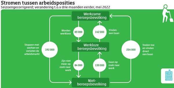 In mei waren 323 duizend mensen werkloos. Drie maanden eerder, in februari, waren er 336 duizend werklozen. In deze periode nam het aantal werklozen dus met 13 duizend af (gemiddeld 4 duizend per maand). Zoals in het bovenstaande schema te zien is, kan de werkloosheid afnemen doordat werklozen werk vinden of zich terugtrekken van de arbeidsmarkt. Daartegenover staat de toestroom naar werkloosheid vanuit de werkenden en vanuit de niet-beroepsbevolking.