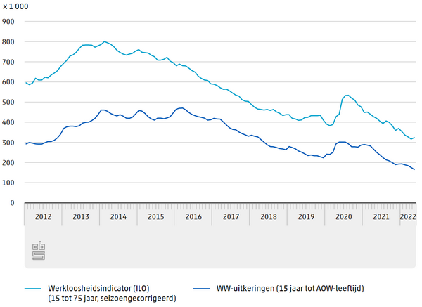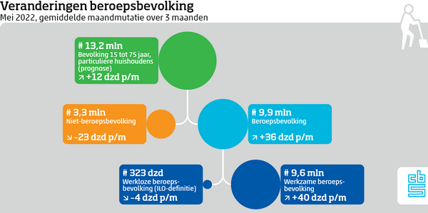 Het aantal werklozen kwam in mei 2022 uit op 323 duizend. Dat is 3,3 procent van de beroepsbevolking. Het werkloosheidspercentage valt daarmee iets hoger uit dan in april 2022, toen dit 3,2 was. Gemiddeld over de afgelopen drie maanden daalde het aantal werklozen wel nog met 4 duizend per maand. Meer mensen gingen in mei op zoek naar werk. Het aantal werkenden van 15 tot 75 jaar nam in de afgelopen drie maanden met gemiddeld 40 duizend per maand toe naar 9,6 miljoen. Dat meldt het CBS op basis van nieuwe cijfers over de beroepsbevolking. UWV registreerde eind mei 165 duizend lopende WW-uitkeringen.