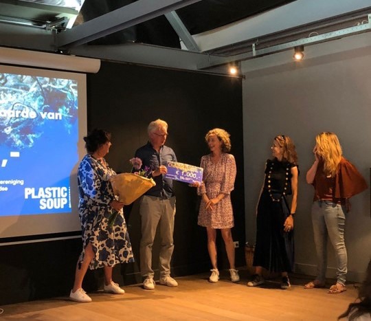 Uitreiking Cheque Harmen Spek van de Plastic Soup Foundation door BNS Crisp leden Barbara Loves, Daphne Wieman, Kirstin Reinink en Carin Frijters.