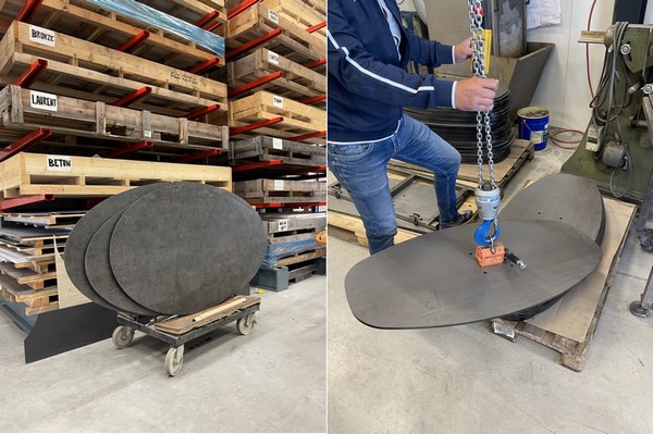 Links keramieken tafelbladen klaar voor montage op het specifieke frame en rechts demonstreert Reinald de nieuwe tilhulp.