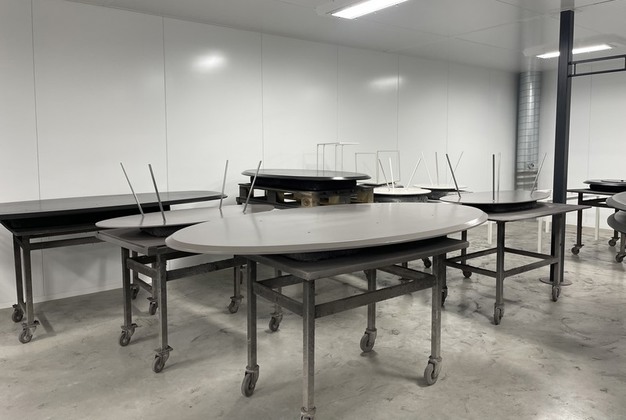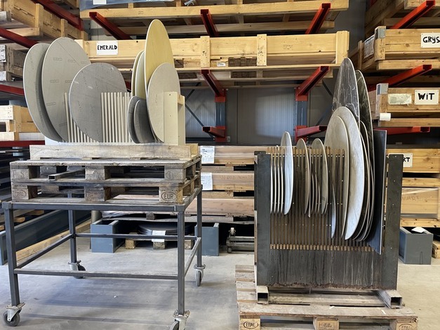 Diverse tafelbladen in de werkplaats.