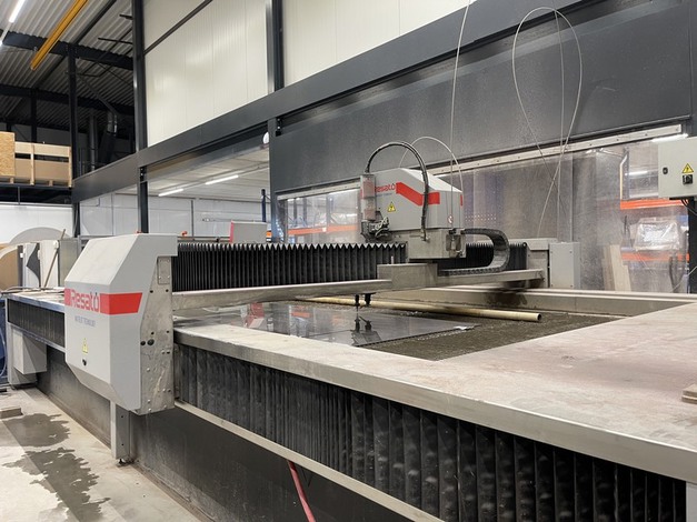 Keramieken tafelbladen worden hier gesneden door een waterjet.
