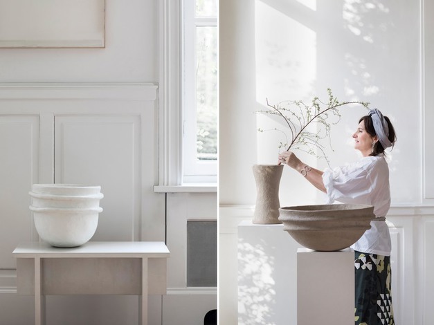 De vormentaal van Marie Michielssen's objecten in papier-maché is zeer sculpturaal. Laag per laag wordt het materiaal opgebouwd en krijgt het voorwerp zijn typische artistieke vorm. Aan haar succesvolle reeks voegt ze nu een aantal schalen, vazen en potten in gebroken wit en naturel bruin toe. Gezien het materiaal zijn de vazen uiteraard niet waterdicht, maar ze zijn prachtig op zichzelf of met gedroogde takken of bloemen.