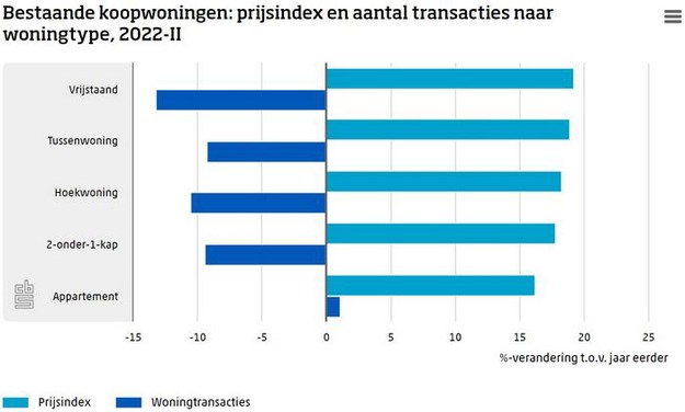 Alle woningtypen waren in het tweede kwartaal van 2022 duurder dan een jaar eerder. De prijsstijging van vrijstaande woningen was met 19,2 procent het grootst. Van bijna alle woningtypen was het aantal transacties lager dan een jaar eerder. Uitzondering waren de appartementen. Hiervan zijn er ruim 1 procent meer van verkocht dan in het tweede kwartaal van 2021.