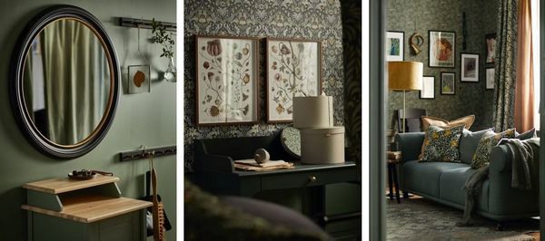 Breng de natuur naar binnen met de op planten en bloemen geïnspireerde kleuren en prints. Combineer de TRÄGSPINNARE gordijnen met bladmotief met de weelderige bloemenprint op de TUVSÄV kussenhoezen en de botanische bloementekeningen in de HOVSTA lijsten. De grijsgroene VISKAFORS sofa brengt harmonie in de ruimte, net zoals de stijlvolle ALMARÖD spiegel en elegante, stoffen STUTERI opbergdozen.