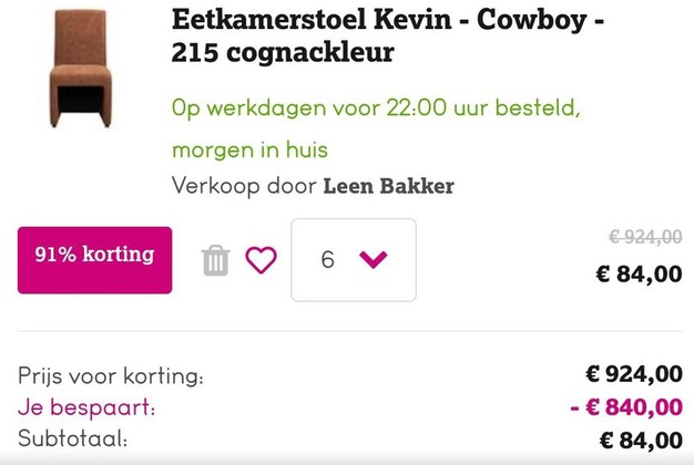 Wie een tijdje geleden online aan het shoppen was bij Leen Bakker kon wel een erg bijzonder aanbod tegenkomen op de website. Enkele uren werden er eetkamerstoelen aangeboden met een korting van maar liefst 91%. Was dat de bedoeling? Zeker niet. “Helaas werd de stoel van type ‘Kevin’ door een handmatige fout aan onze zijde gedurende een paar uur met een onbedoelde en onrealistisch hoge korting van meer 90 procent aangeboden in onze webshop”, zo communiceerde Leen Bakker achteraf.