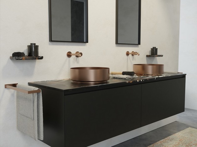Opbouwwaskommen zijn al een tijdje trending. Ze vormen een volwaardig deel van het badkamerinterieur en worden met trots geëtaleerd. Bij X²O Badkamers fungeert het badkamermeubel vandaag als sokkel, waarop geanodiseerde waskommen als piece of art hun intrede doen. De Balmani Accia in Brushed-uitvoeringen RoseGold, GunMetal of Champagne Gold zorgt zo voor een sculpturaal hoogtepunt en een artistiek badkamerinterieur.