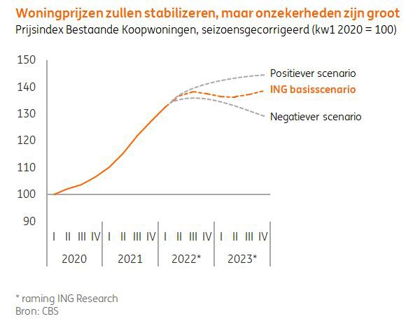Recente ontwikkelingen wijzen erop dat de Nederlandse woningmarkt afkoelt. Zo ligt de geringe huizenprijsstijging van 0,1% in juni in lijn met de afvlakking van de prijzen richting stabilisatie uit ons basisscenario. Een flinke daling van de huizenprijzen achten we op dit moment nog minder waarschijnlijk. Dat meldt ING.