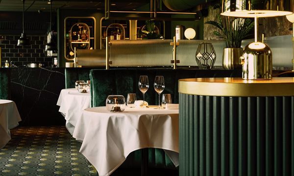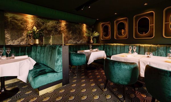 Het meubilair van Satelliet Meubelen en het design van Horeca Sfeermakers heeft een 'nieuwe wereld' gecreëerd door middel van diep donkergroen velvet in combinatie met messing elementen en een grafische art deco print op de vloerbedekking.