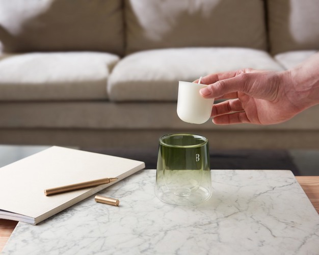 De gepatenteerde dubbelwandige glas zorgt ervoor dat de navulling altijd volledig opbrandt. Er gaat dus geen wax meer verloren en is de houder herbruikbaar. De groene kleur van het glas is na uitgebreid onderzoek onder consumenten bepaald. Deze kleur werd door de ondervraagden als meest stijlvol en sfeervol beoordeeld.
