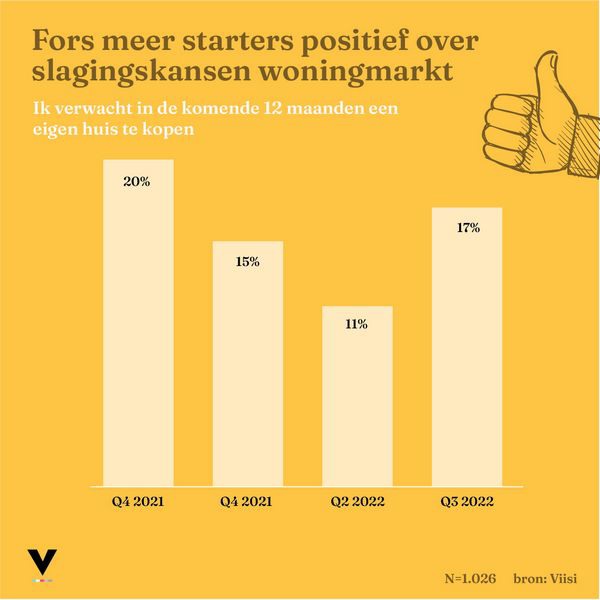 Zeventien procent van alle starters op de Nederlandse woningmarkt verwacht in de komende twaalf maanden hun eerste huis te kopen. Het sentiment onder koopstarters herstelt zich hiermee van een voorlopig dieptepunt (elf procent) in het vorige kwartaal. Dit blijkt uit de Startersbarometer Q3 2022 van Viisi Hypotheken, een periodiek onderzoek, deze keer onder 1.026 Nederlanders tussen de 22 en 35 jaar oud zonder koopwoning, uitgevoerd door Panelwizard. Van alle respondenten denkt maar liefst vijfentwintig procent dat hun positie op de woningmarkt zich dit kwartaal verder verbetert.