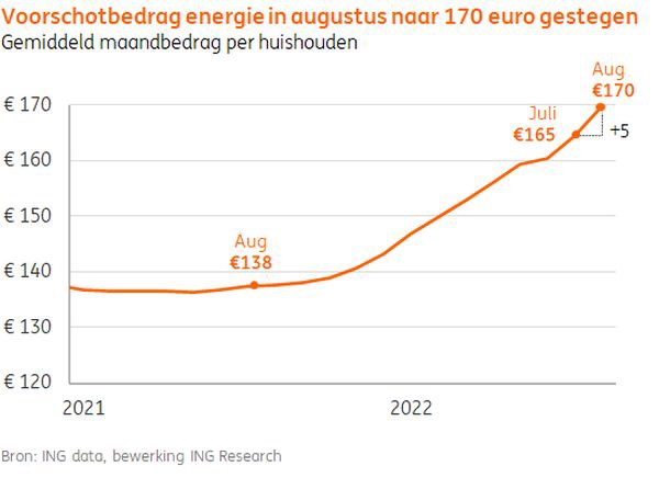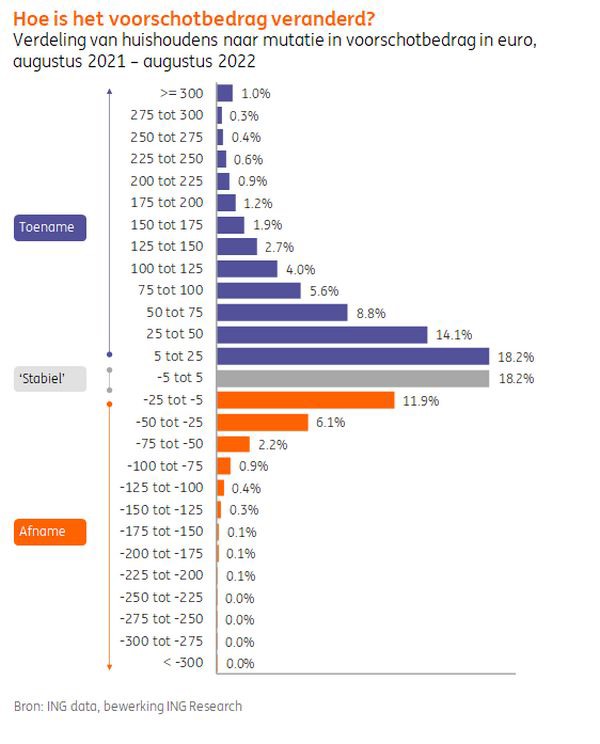De fors gestegen energieprijzen komen met vertraging op het bordje van de consument terecht. Stap voor stap loopt het gemiddelde voorschotbedrag verder op, zo blijkt uit analyse van onze transactiedata. Inmiddels is het verschil met aan jaar geleden al 23%. Dat zet de bestedingen onder druk. Dat meldt ING in een persbericht.