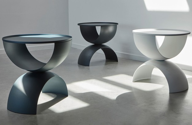 Frederik Roijé heeft de schoonheid van bogen vertaald naar een bijzettafel. Twee komgewelven van staal dragen het tafelblad.