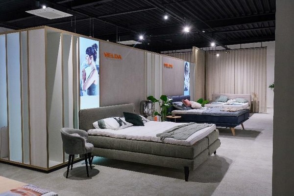 In 2021 kreeg de Velda showroom een complete metamorfose door de introductie van de 4 Velda Moods. Deze Moods (Essential, Icon, Sense en Omni) dienen om een duidelijke structuur in hun collecties te brengen zodat consumenten eenvoudig een keuze kunnen maken in hun uitgebreide assortiment. De showroom werd een ware belevingsruimte: volledig gedecoreerde boxspringscombinaties als lifestylecorners, een stalenkamer als co-creatieruimte en een sfeervolle lounge zoals in een luxehotel. Met een oppervlakte van meer dan 700 m² stelt het Veldeman Bedding in staat om hun volledige Velda collectie te tonen. Klanten kunnen in alle rust gaan proefliggen op alle matrassen in verschillende hardheden. Maar ook diverse opstellingen van hun boxspringcollecties zijn doelgericht gekozen om alle mogelijkheden van het merk te tonen. Denk hierbij aan stoffen, hoofdborden, poten en accessoires die een boxspring een totale andere look kunnen geven. De zelfde beleving is moeilijk door te trekken naar een beperkte beursoppervlakte. Daarnaast staat deze huisshow gekend als een event waar de klanten in de watten gelegd worden met topcatering. Veldeman Bedding verkiest er daarom voor om een thuismatch te spelen en trekt in eigen huis alle registers open en legt Meubelbeurs Brussel even langs zich neer.
