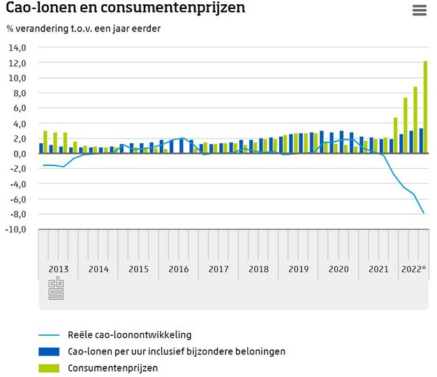 In de beschikbare (jaar)cijfers van de cao-lonen en de consumentenprijsindex (cpi) die teruggaan tot 1973, is het niet eerder voorgekomen dat de ontwikkeling van de cao-lonen zover achterbleef bij de inflatie. De inflatie, die jarenlang niet boven de 2,7 procent per kwartaal uitkwam, is de laatste tijd opgelopen tot boven de 12,0 procent, vooral als gevolg van de snel stijgende energieprijzen. De lonen volgen de economische ontwikkeling met enige vertraging, onder andere doordat cao’s voor een langere periode worden vastgelegd. In het derde kwartaal stegen de cao-lonen 8,9 procentpunt minder dan de consumentenprijzen. De reële cao-loonontwikkeling is daarmee -7,9 procent.