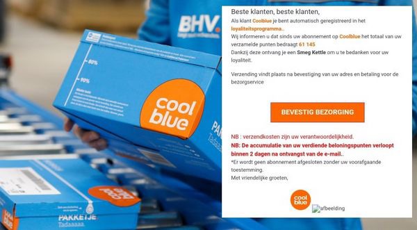 Coolblue zegt alles te doen voor een glimlach en oplichters hopen nu uit naam van de winkel een glimlach bij zichzelf te bezorgen. Trouwe klanten zouden een beloning kunnen aanvragen, een zogenaamde Smeg Kettle, en daarvoor moeten ze alleen even wat gegevens achterlaten. Hiermee hopen criminelen onder andere bankgegevens buit te maken. Dat meldt Opgelicht?! van Avrotros.