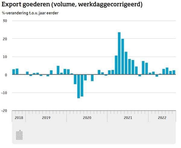 Het volume van de goederenexport was in augustus 2,5 procent groter dan in augustus 2021, meldt het CBS. De groei is iets groter dan in juli. Er werden in augustus vooral meer machines en apparaten uitgevoerd. Het volume van de goederenimport was in augustus 1,2 procent groter dan in augustus 2021. Volgens de CBS Exportradar zijn de omstandigheden voor de export in oktober minder gunstig dan in augustus.
